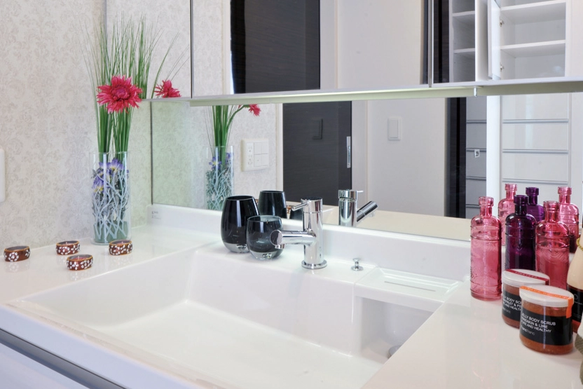 スタイリッシュで高級感漂うワイドなスクエアタイプのボウルを採用。カウンターとボウルが一体型なのでお手入れも簡単です。