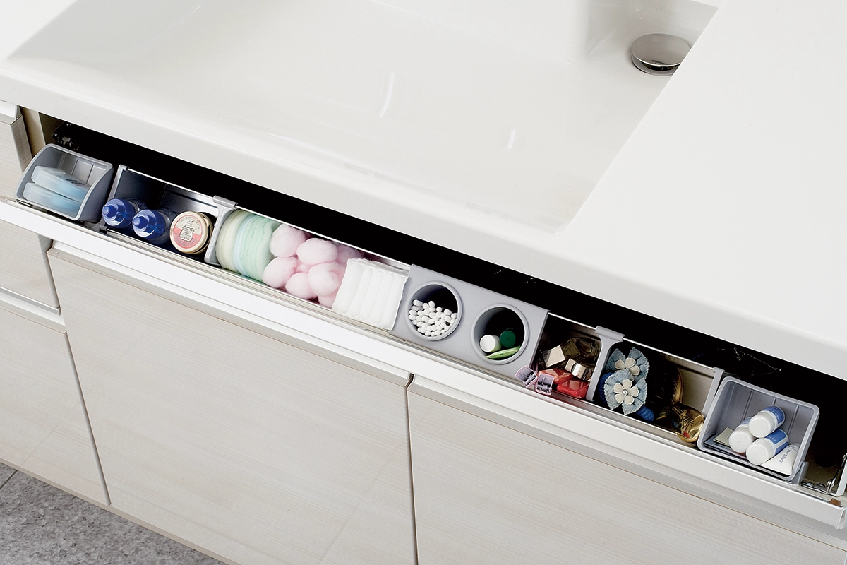 使いやすい場所に、ぱたっと開いて取り出しやすいポケット収納。綿棒やブラシなどの収納に便利です。