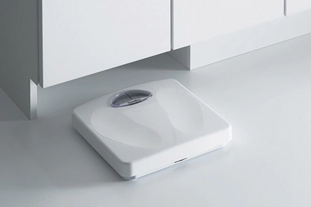 置き場所に困りがちなヘルスメーターを洗面台の足元にスッキリ収納。