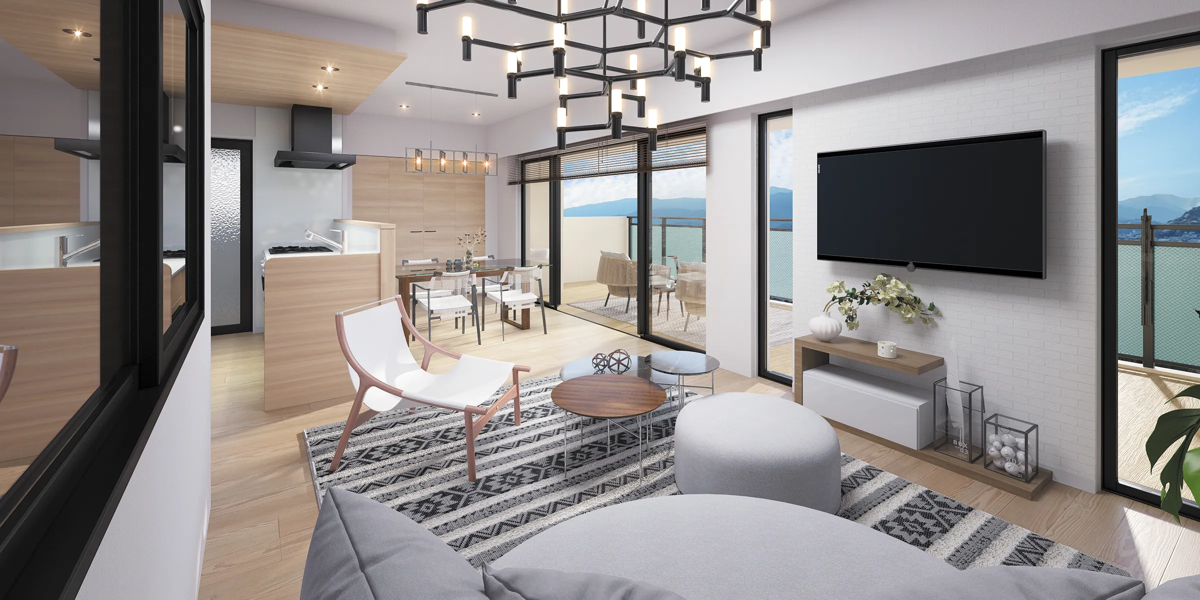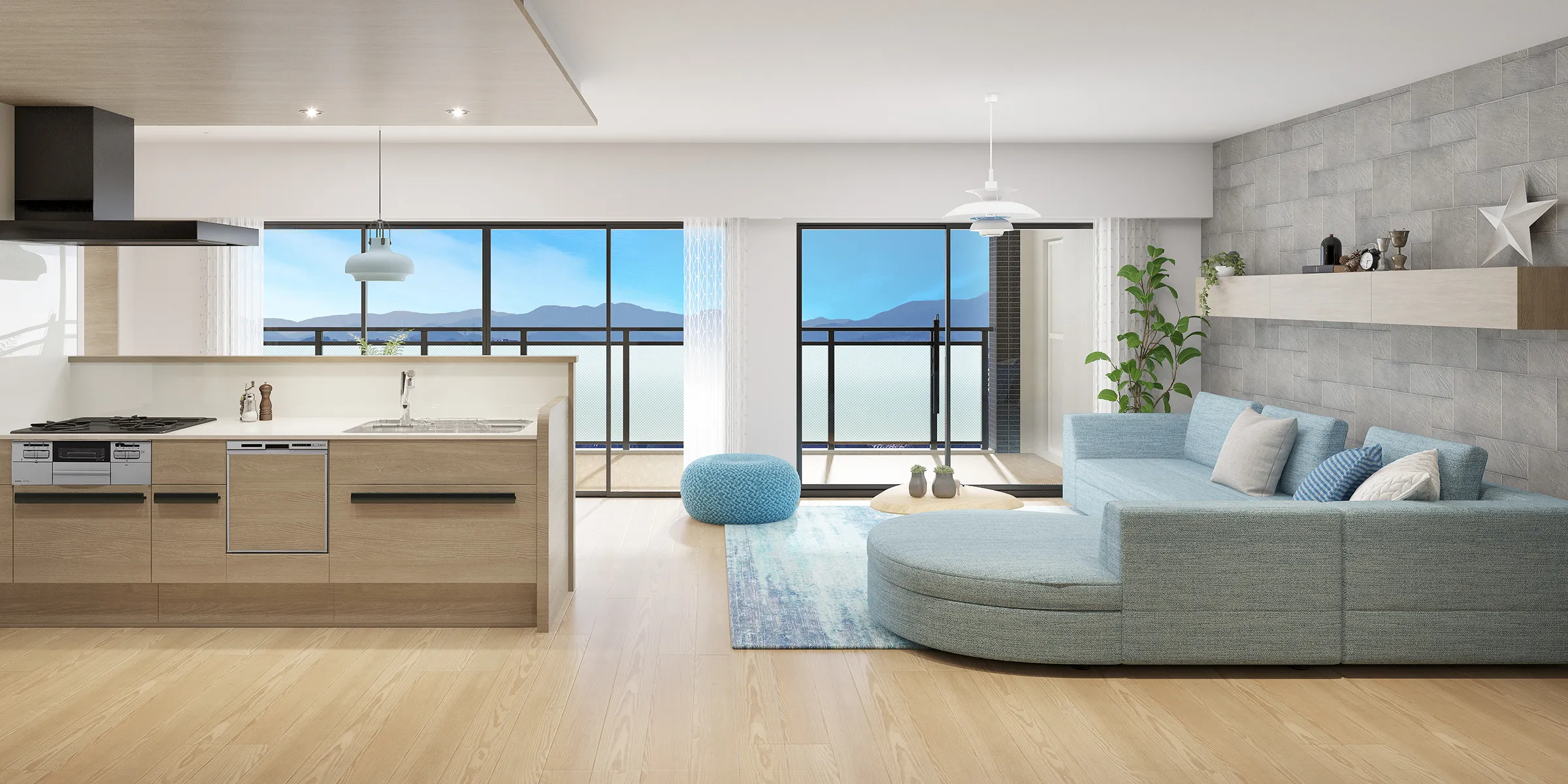 ワイドスパンバルコニーからは、光が差し込み部屋全体を明るく、さらに開放的な空間に。