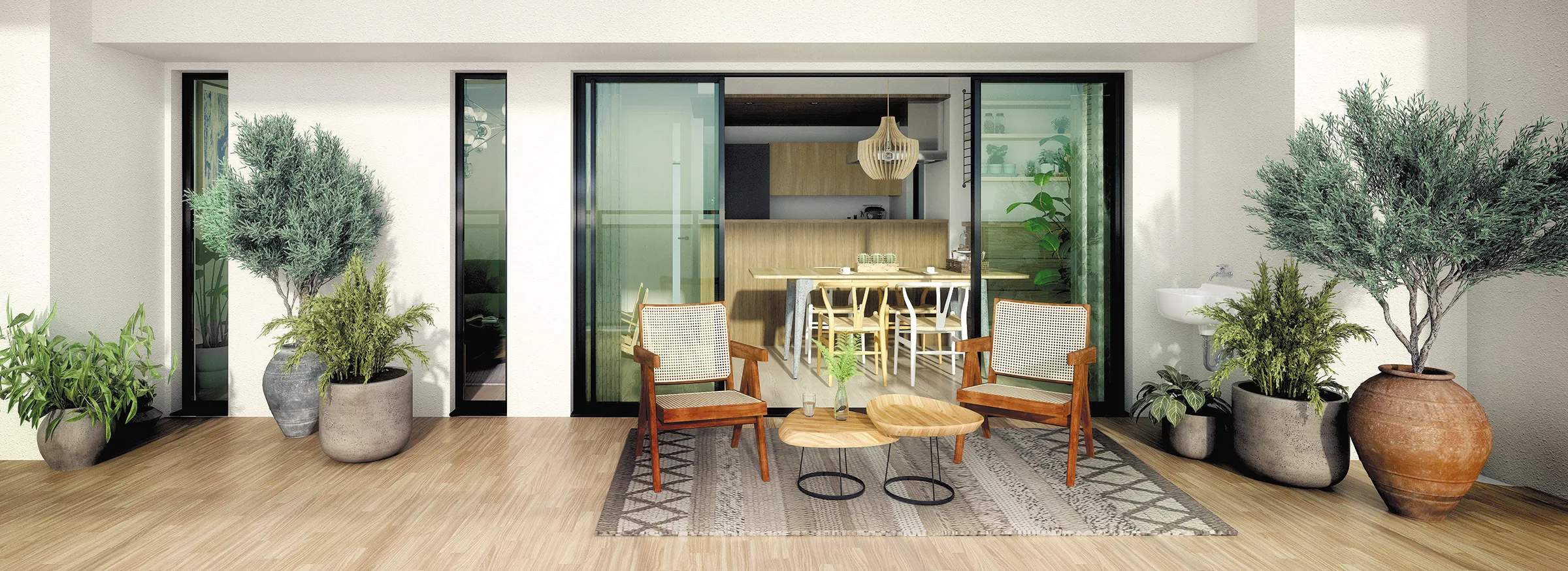 朝は陽だまりの中でコーヒーを、昼は開放的なワークスペースとして、夜は風を感じるリラックス空間に。