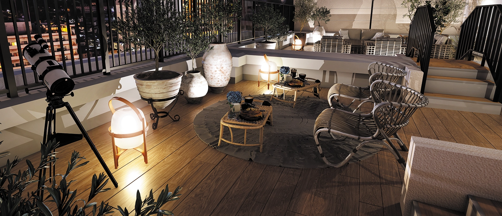 - ●屋上の専用テラスでは、ガーデニングやゴルフの練習、ベランピングなど家族の楽しみが広がります。