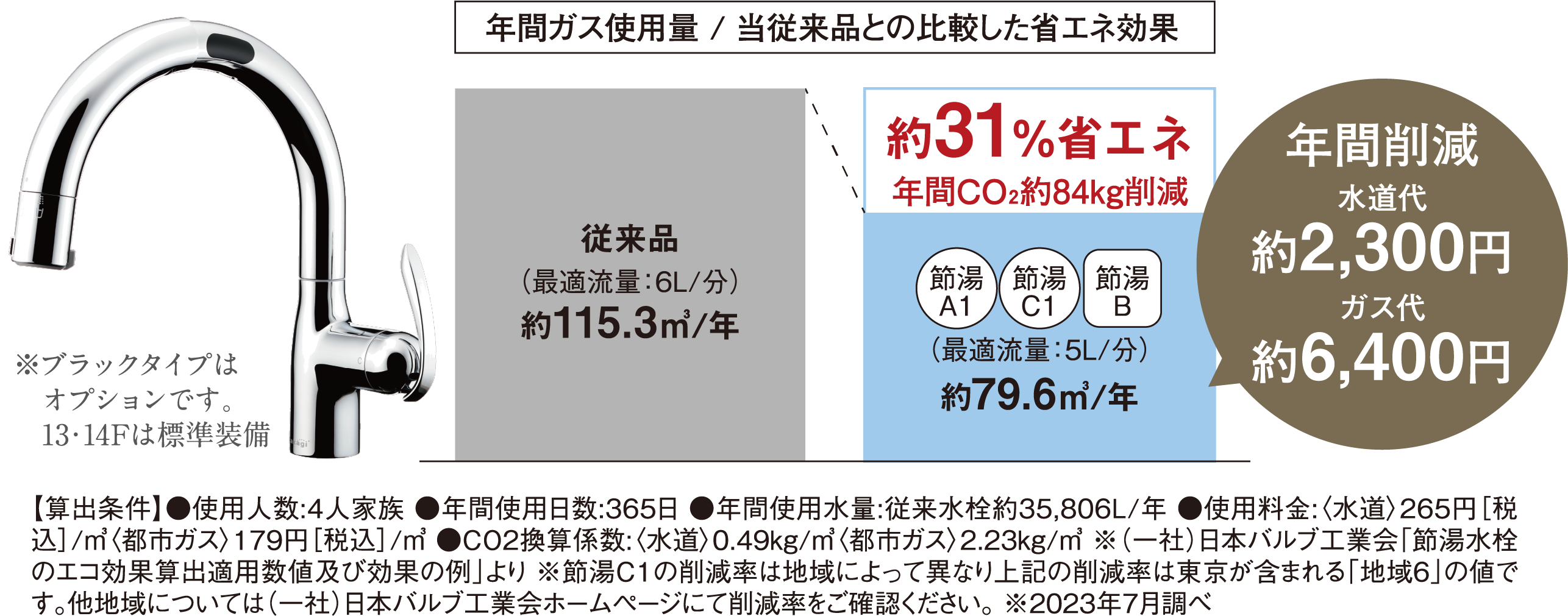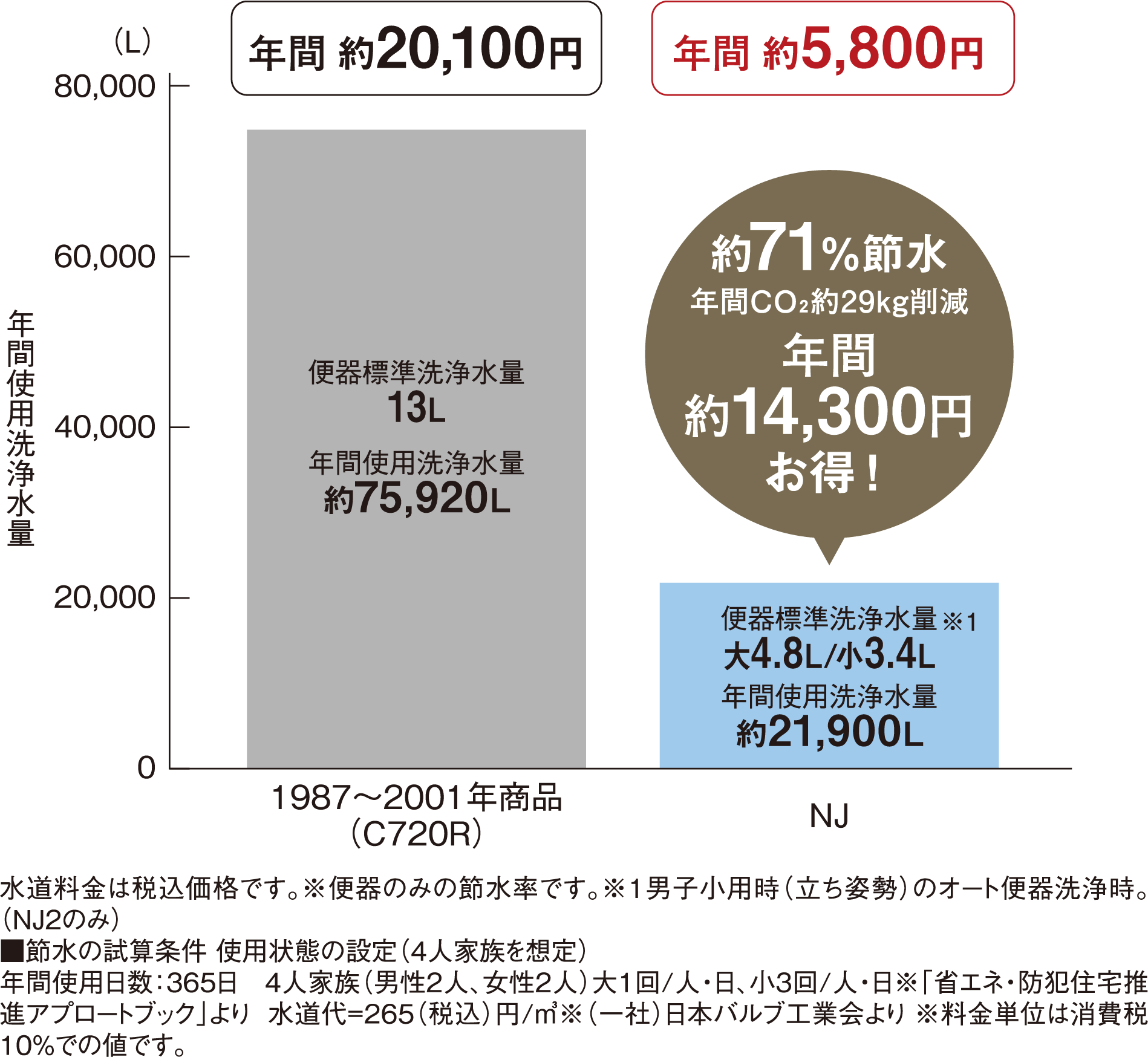 13L便器からおよそ1/3の水で洗浄する、進化した節水技術。 普段通り使っているだけで、いつの間にか節水できます。