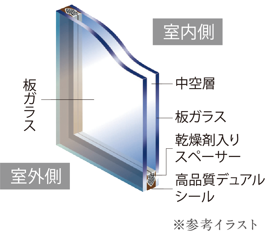 ペアガラスは、断熱効果が高く、冬は暖房・夏は冷房の使用量を減らすことができ省エネ・節電につながります。室内外の温度差を少なくすることで、結露の発生を軽減します。