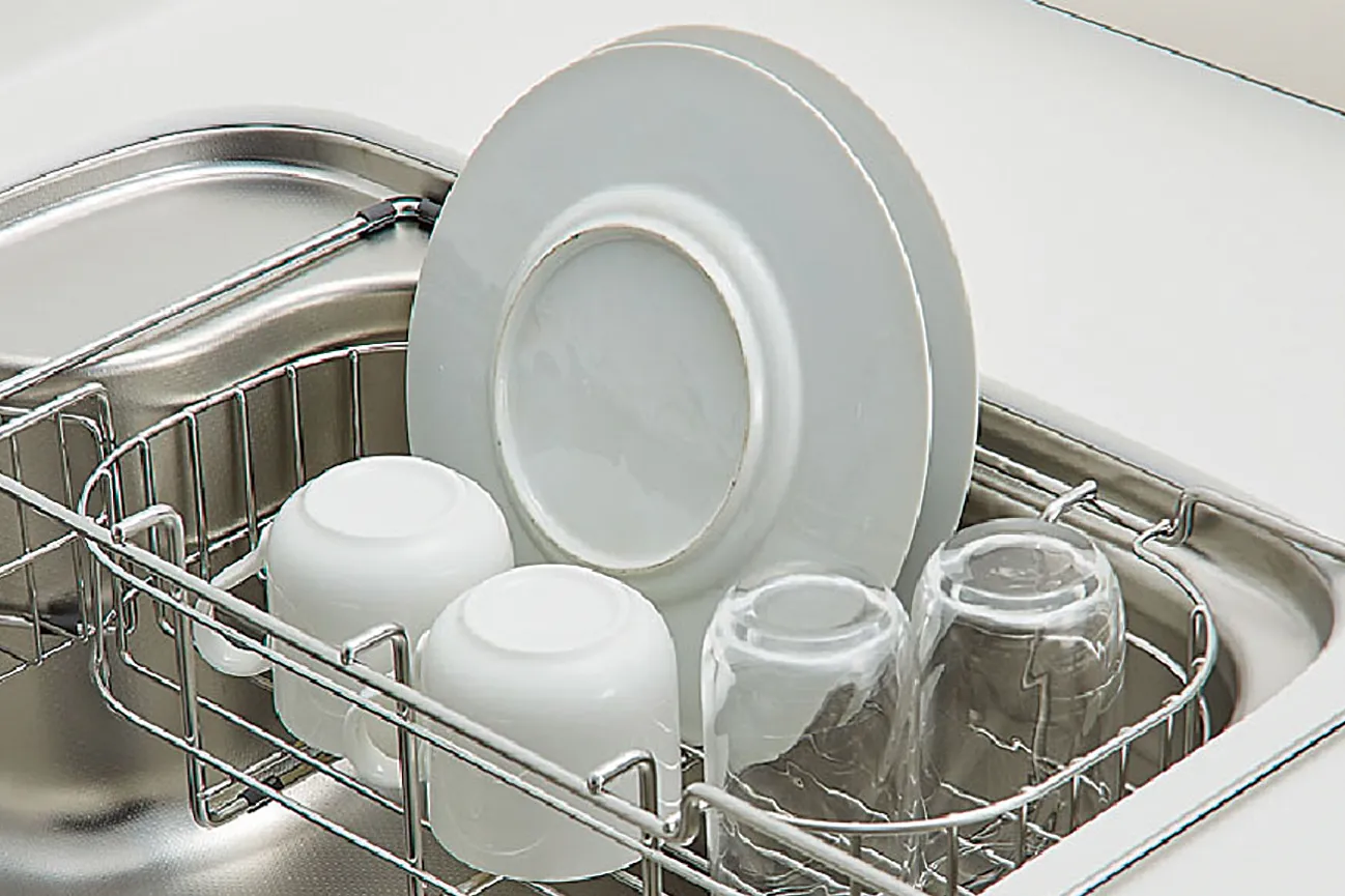 洗い物をシンク内で水切りできる水切りカゴ。シンクまわりがすっきりと片付きます。