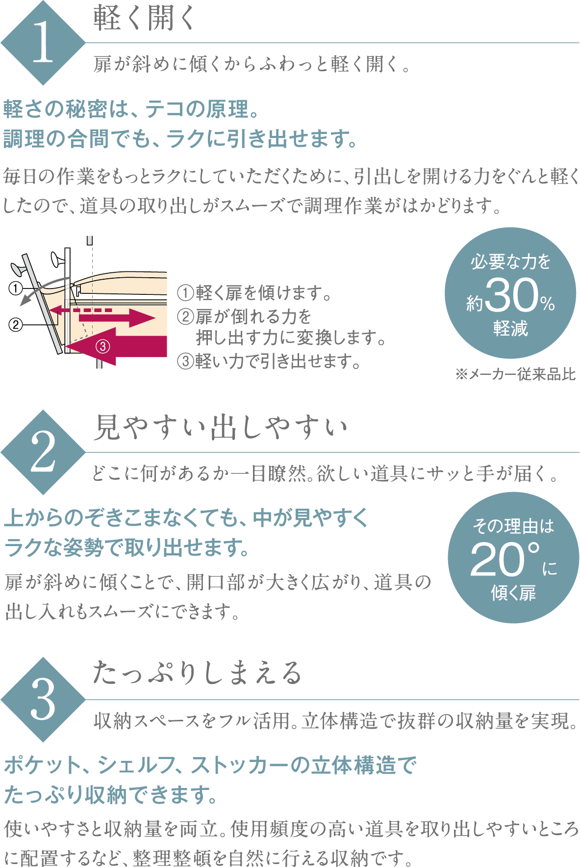 軽く開き、道具一式が一度の開閉で見えて、取り出せるフロア収納など、