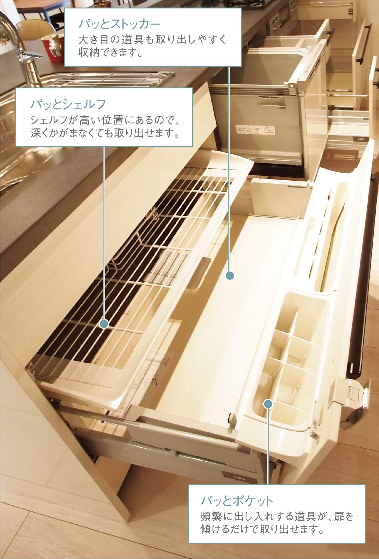 場所ごとに決まった食器を入れる従来の収納カゴを改良。大小の食器や調理器具など、順序も気にせずスムーズにセットできます。