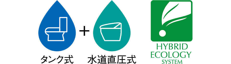 水圧に左右されない「タンク式」とタンクレスでコンパクトな「水道直圧式」の長所を融合させた洗浄技術。水道から直接流れる水と内蔵タンクから加圧されて流れる水、ふたつの水によってパワフルに洗浄します。