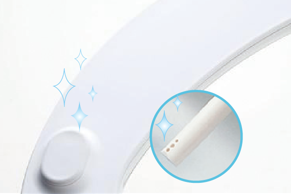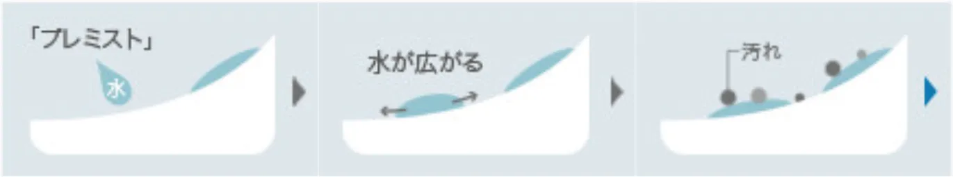 自動で便器にミスト(水)をふきつけて水のクッションを作り、汚れをつきにくくします。便器表面をツルツルにする「セフィオンテクト」との相乗効果で、便器を汚れから守ります。