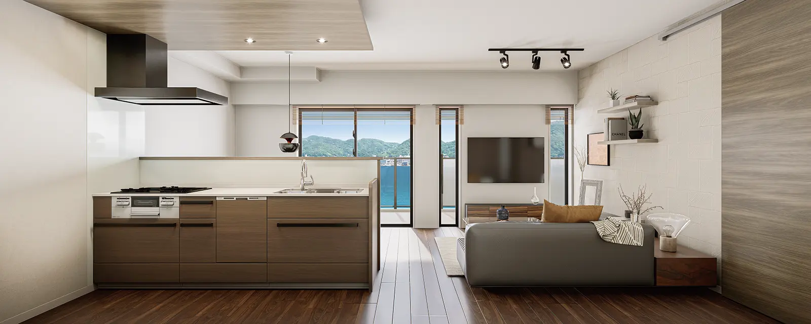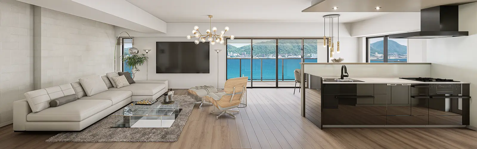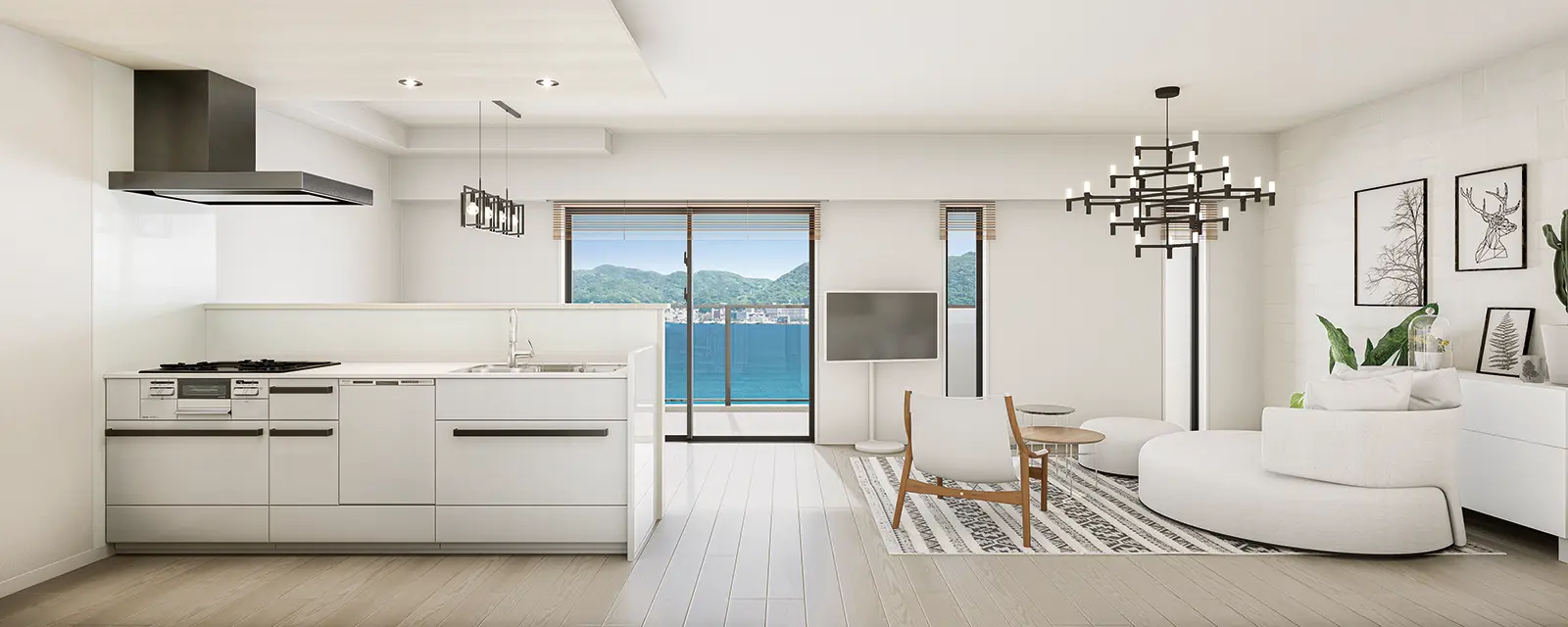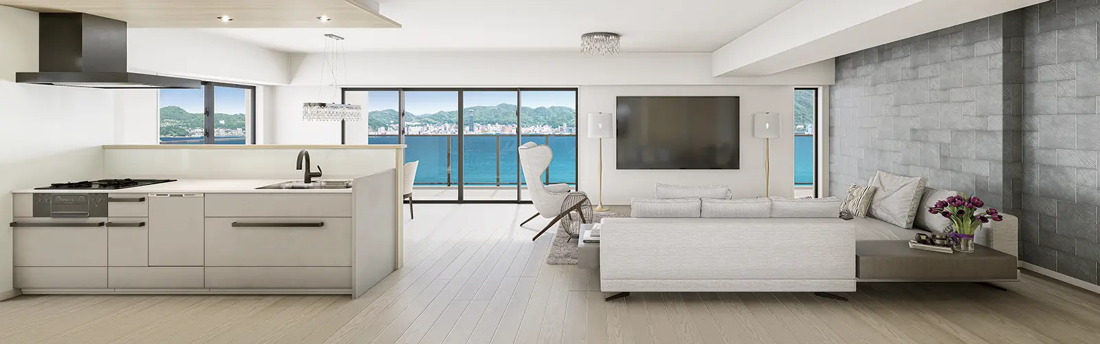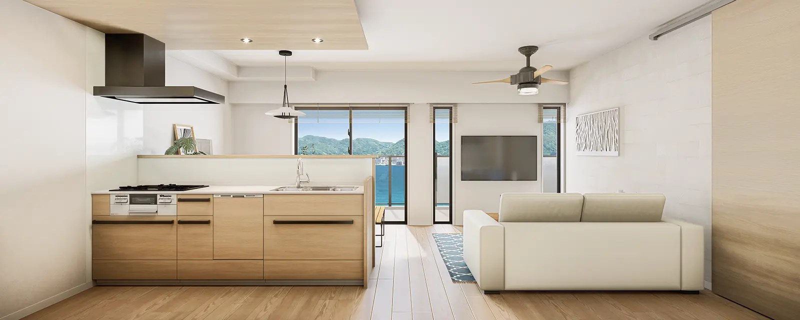 19帖以上のリビングをワイドスパンバルコニーが織りなす開放的な空間。