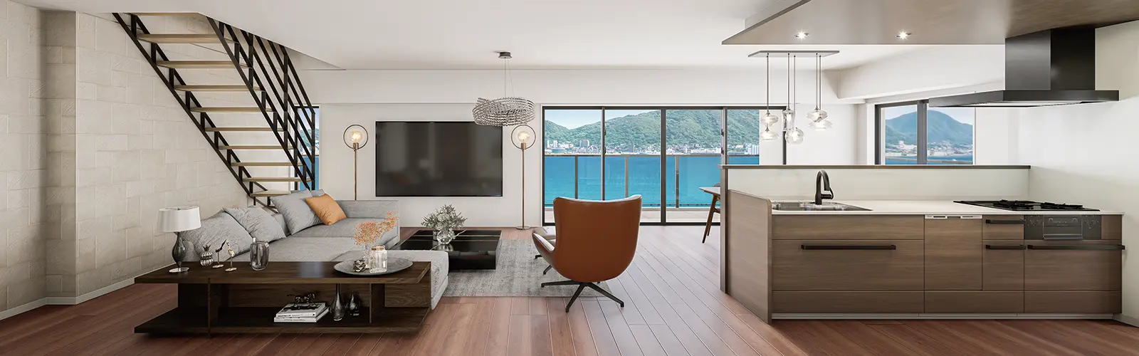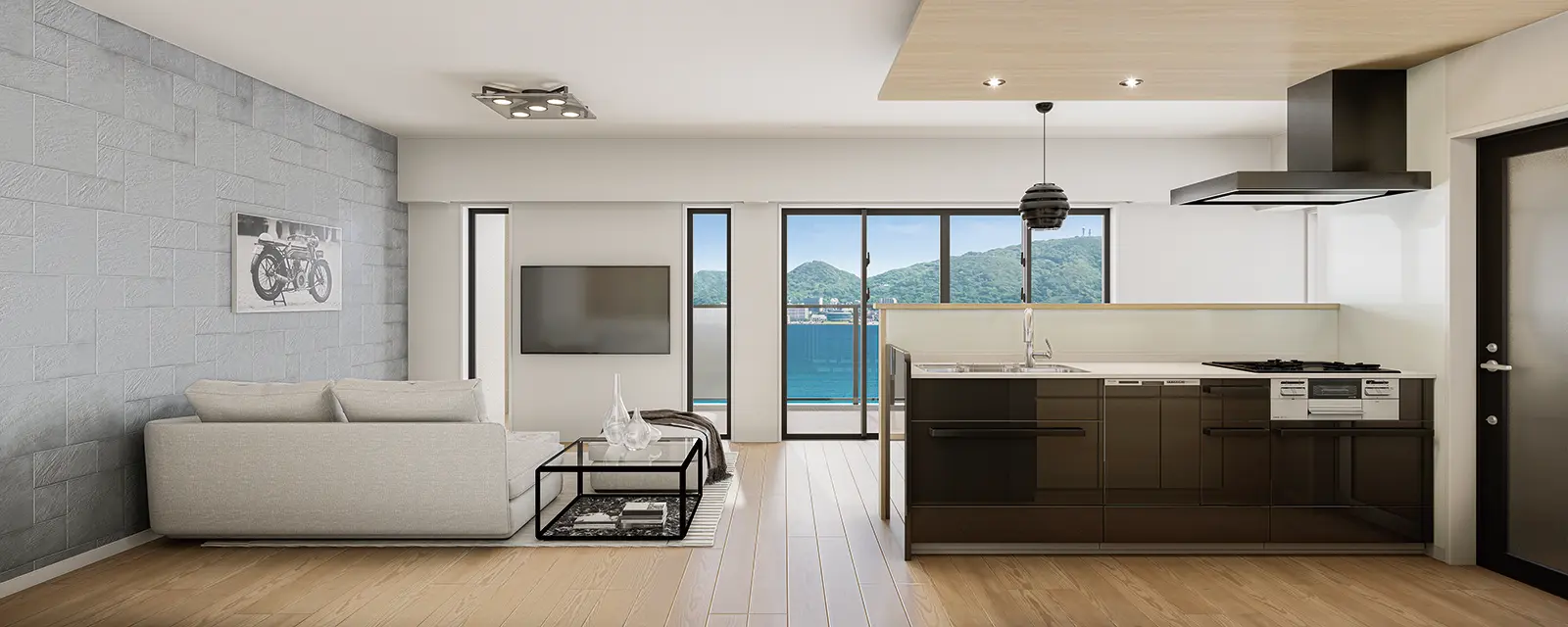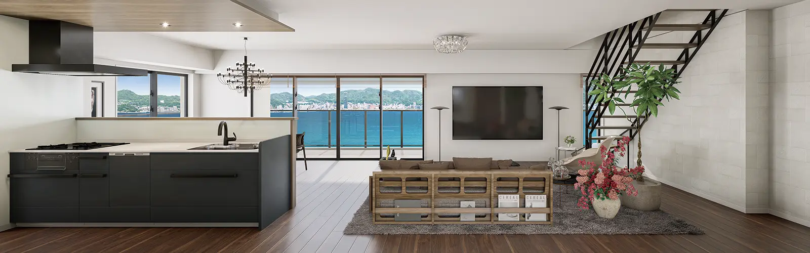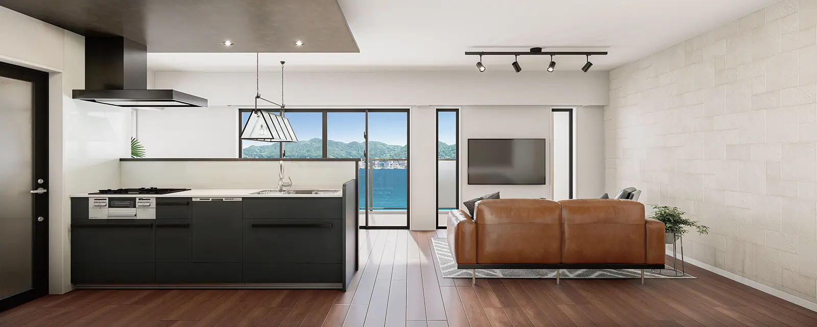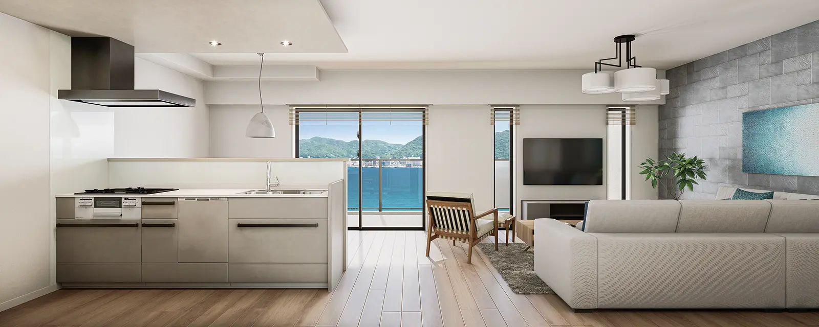 19帖以上のリビングをワイドスパンバルコニーが織りなす開放的な空間。