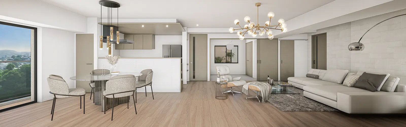 - ●31.3帖の広々としたリビングと奥行2.7mのバルコニーが織りなす、開放的な空間。
