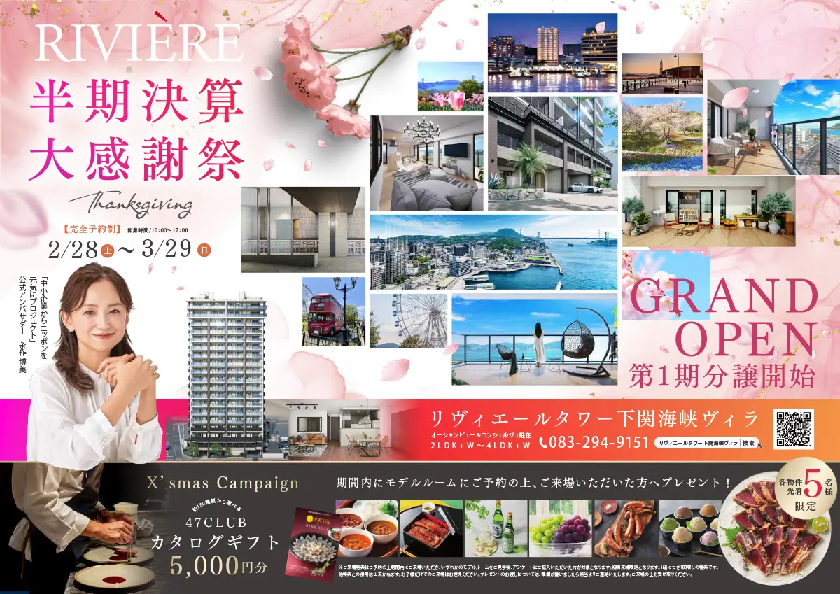 リヴィエール南小倉駅前パークシティ、リヴィエール八幡中央ガーデンテラス、リヴィエールタワー下関海峡ヴィラの3物件で、2月28日(土)より「上期決算大感謝祭」を開催します。