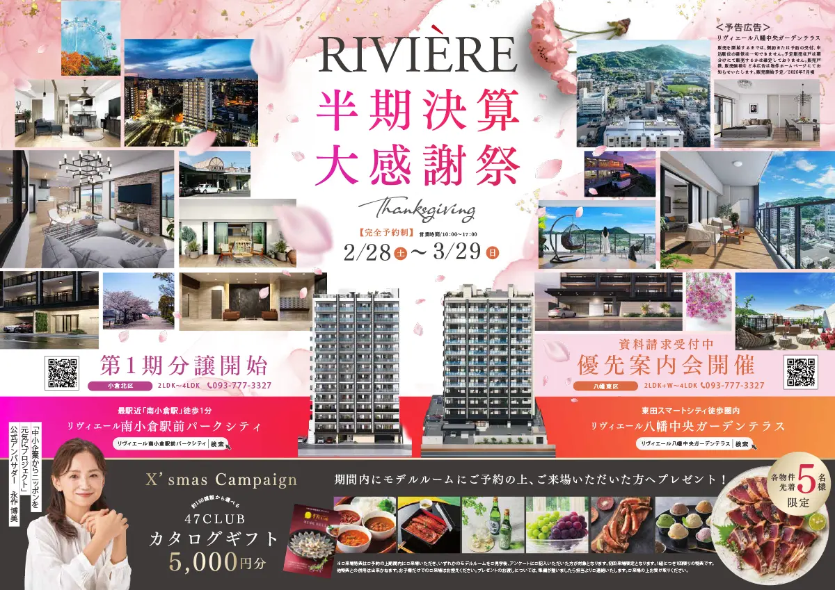 リヴィエール南小倉駅前パークシティ、リヴィエール八幡中央ガーデンテラス、リヴィエールタワー下関海峡ヴィラの3物件で、2月28日(土)より「上期決算大感謝祭」を開催します。